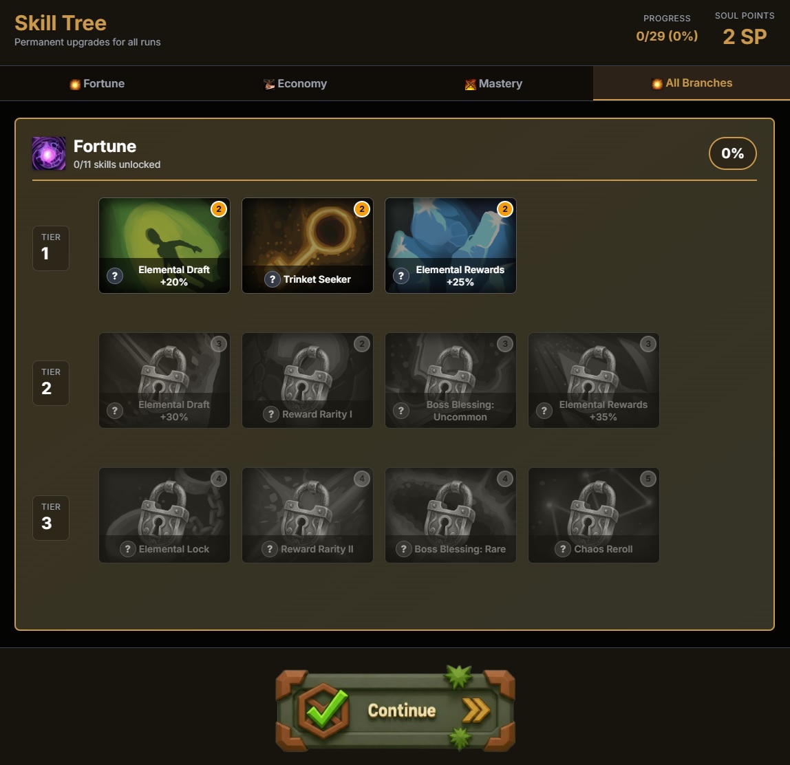 - Roguelite Progression: Earn Soul Points to unlock passive skills across three unique branches, permanently enhancing your strategy.