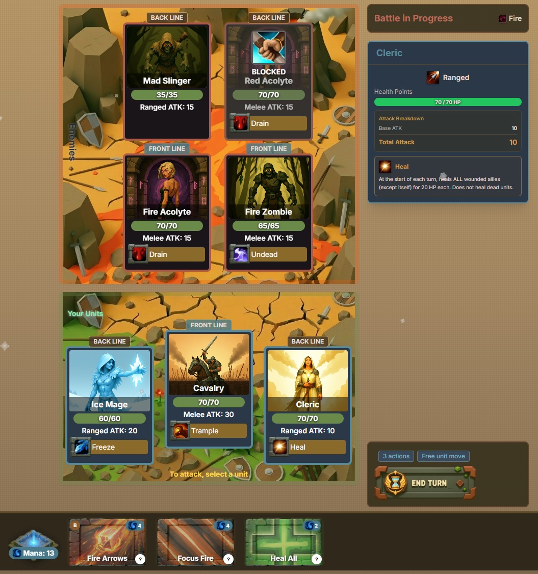 Command an army of heroes in this fusion of grid-based conquest and deck-building, where you battle elemental factions across a strategic map. Build your deck that grows stronger over time with new units. Draft a fresh hand for each run to navigate the grid and capture territories before the enemy overwhelms you. Master formation-based combat and use spells fueled by your lands to defeat bosses and earn Soul Points for permanent roguelite upgrades!